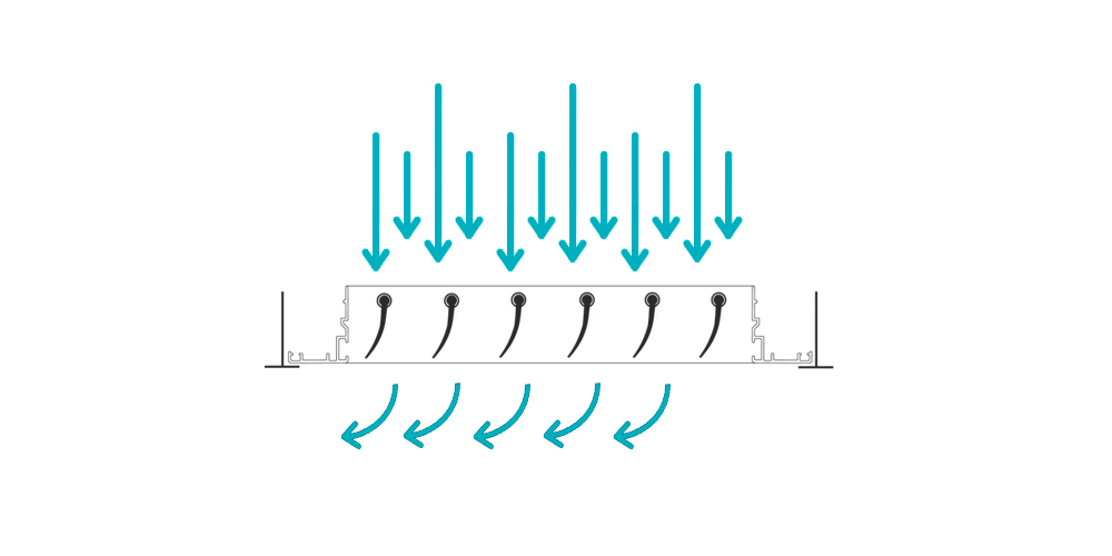 Como podemos ver en la imagen el aire entraría recto, pero al pasar por las lamas curvas el aire toma la dirección a la que ajustemos las lamas en caso de ser orientables.